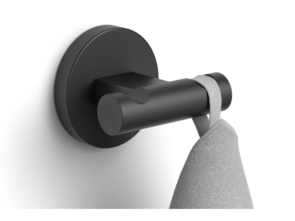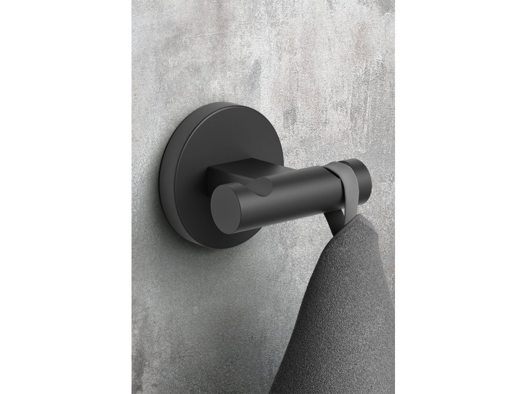 Dvojitý háček na ručníky z černého práškově lakovaného nerezového oceli pro koupelny a kuchyně, praktický pro ručníky s poutkem i bez něj.
