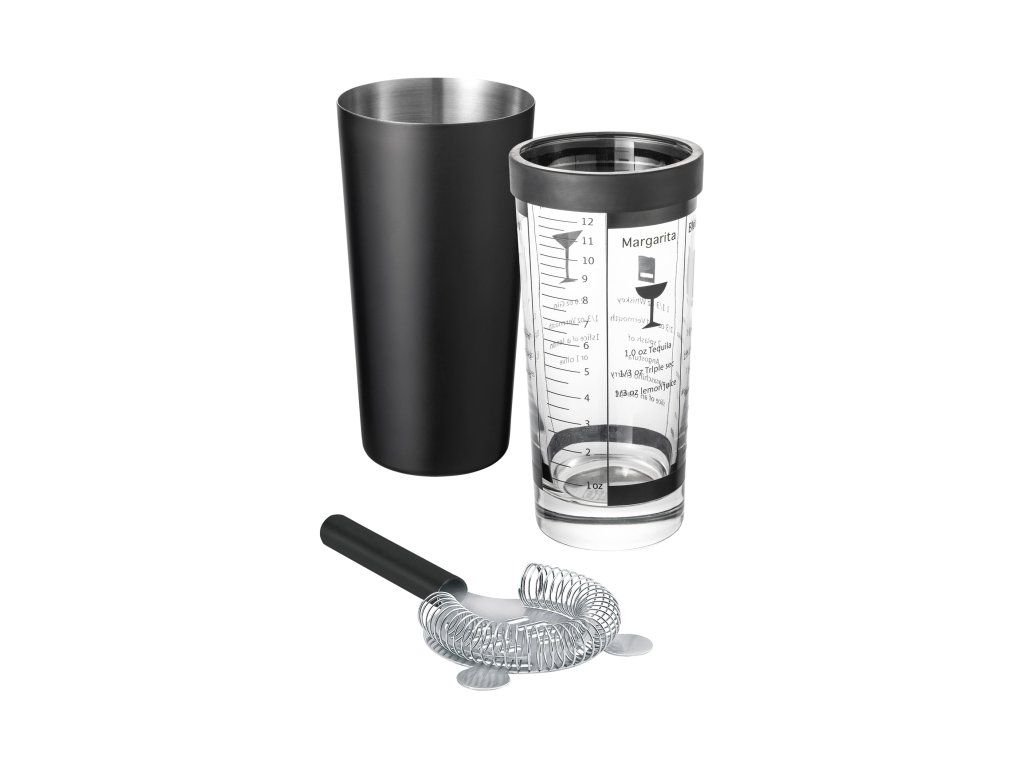 Máte rádi míchané koktejly a dopřávali byste si je rádi nejen v baru, ale i doma? Chcete ohromit své přátele vlastnoručně připraveným drinkem? Skleněná nádoba s ryskou je opatřena gumou, která těsní a zároveň chrání sklo před poškrábáním. Na nádobě je několik receptů na nejoblíbenější drinky (Manhattan, Dry Martini, Daiquiri, Margarita a Bloody Mary). Součástí sady je i strainer (sítko), s jehož pomocí můžete nalévat míchané nápoje. Lze mýt v myčce. Sada obsahuje : 1x shaker, 1x odměrka, 1x strainer. Objem 500 ml.Doplňkové parametry